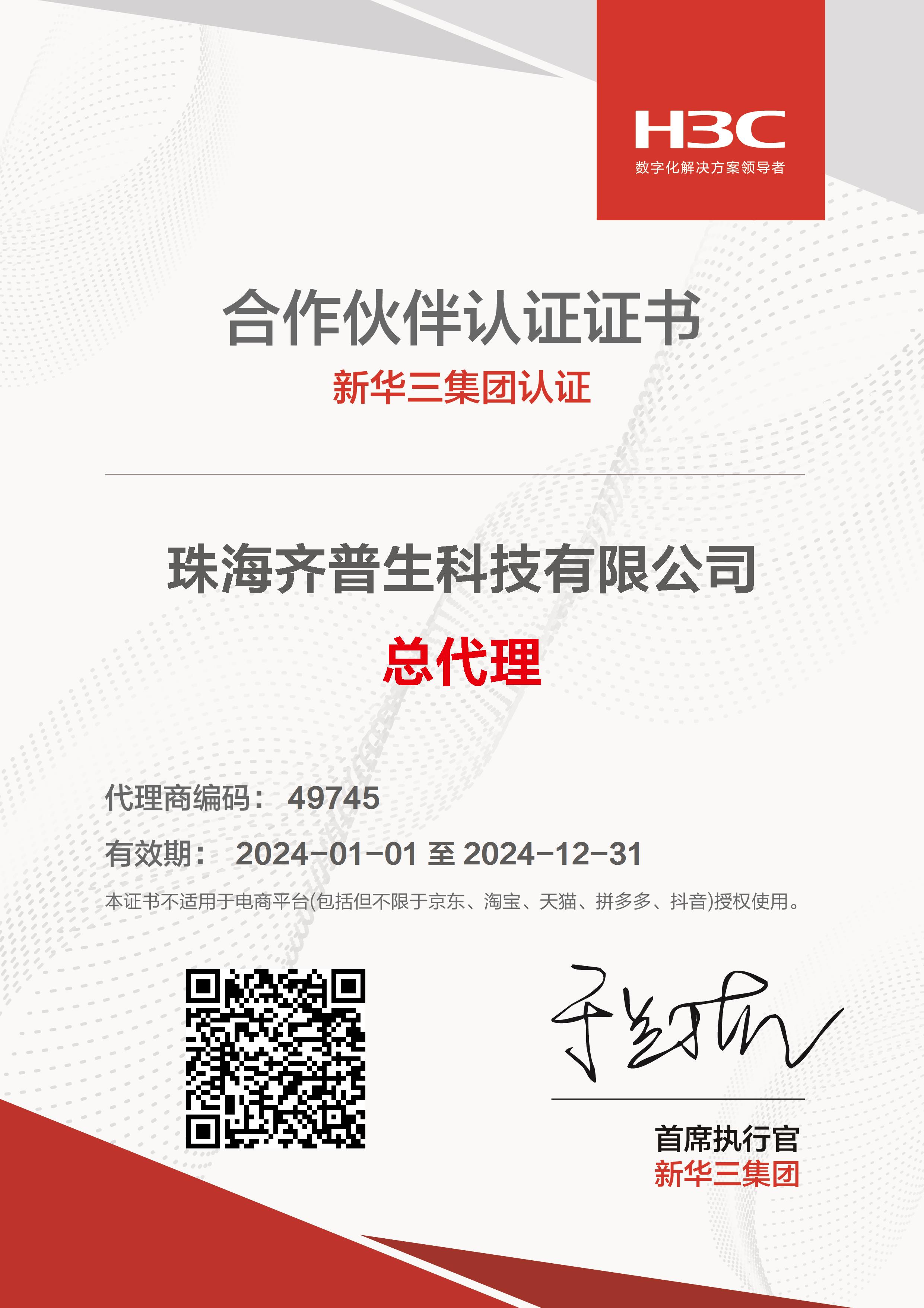 • H3C總代證書(珠海公司)